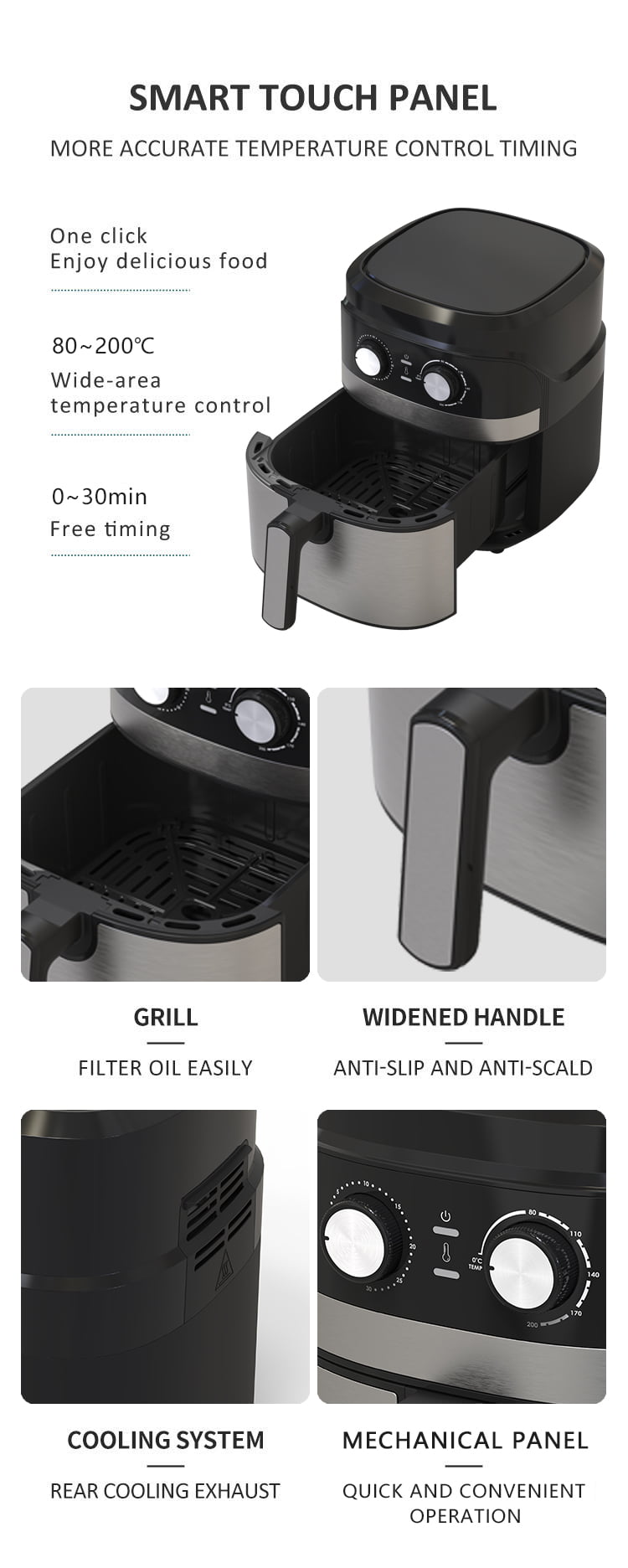 Fryer Udara YYZG-550S 5.5L adalah alat dapur yang fleksibel yang dirancang untuk memasak hijau dan praktis. Dengan kenop yang ramah pengguna mengelola, mengatasi suhu dan pengaturan pengatur waktu sangat mudah, memastikan kelola yang unik di atas sistem memasak. Panel mekanik tidak lagi hanya menyederhanakan operasi tetapi juga menggabungkan keamanan terlalu panas untuk keamanan yang dibawa selama penggunaan. Karakteristik waktu yang tidak dikencangkan 0-30 menit memungkinkan penyesuaian instance memanggang, melayani banyak resep. Lantai memasak non-stick yang indah memungkinkan pembersihan yang lancar, sementara delapan menu pintar bawaan merampingkan rever memasak. Struktur laci penggorengan udara memberikan kepraktisannya, memberikan akses yang lancar ke makanan dan meningkatkan kenyamanan pengguna biasa.